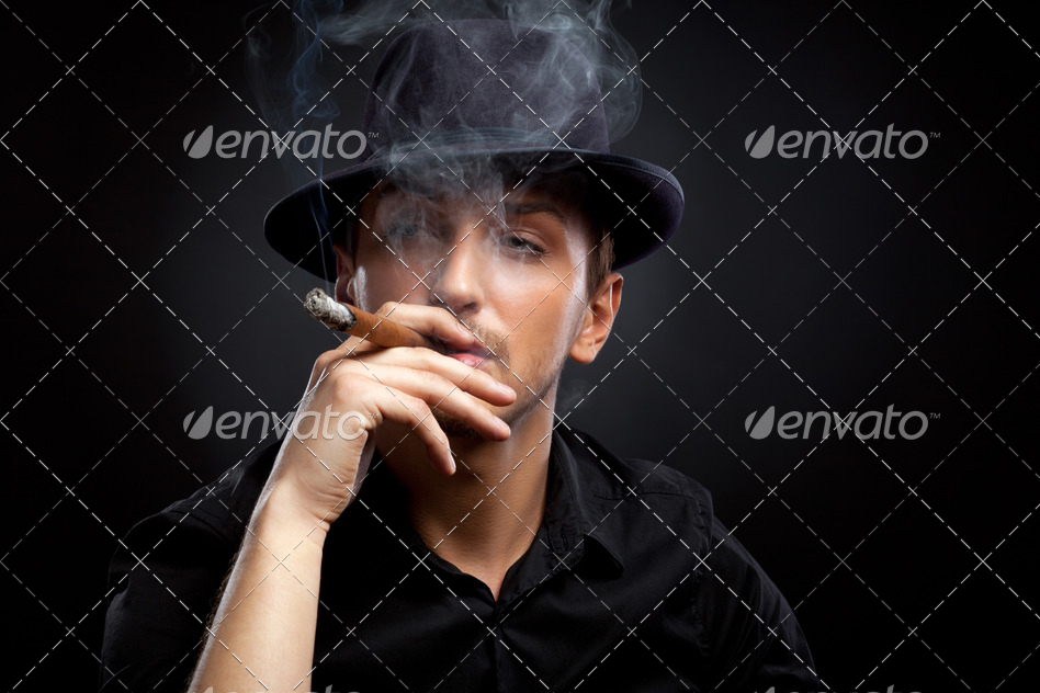 Gangster look. Man with hat and cigar. Gangster look. Handsome man with hat and cigar. Previous Attachment Next Attachment